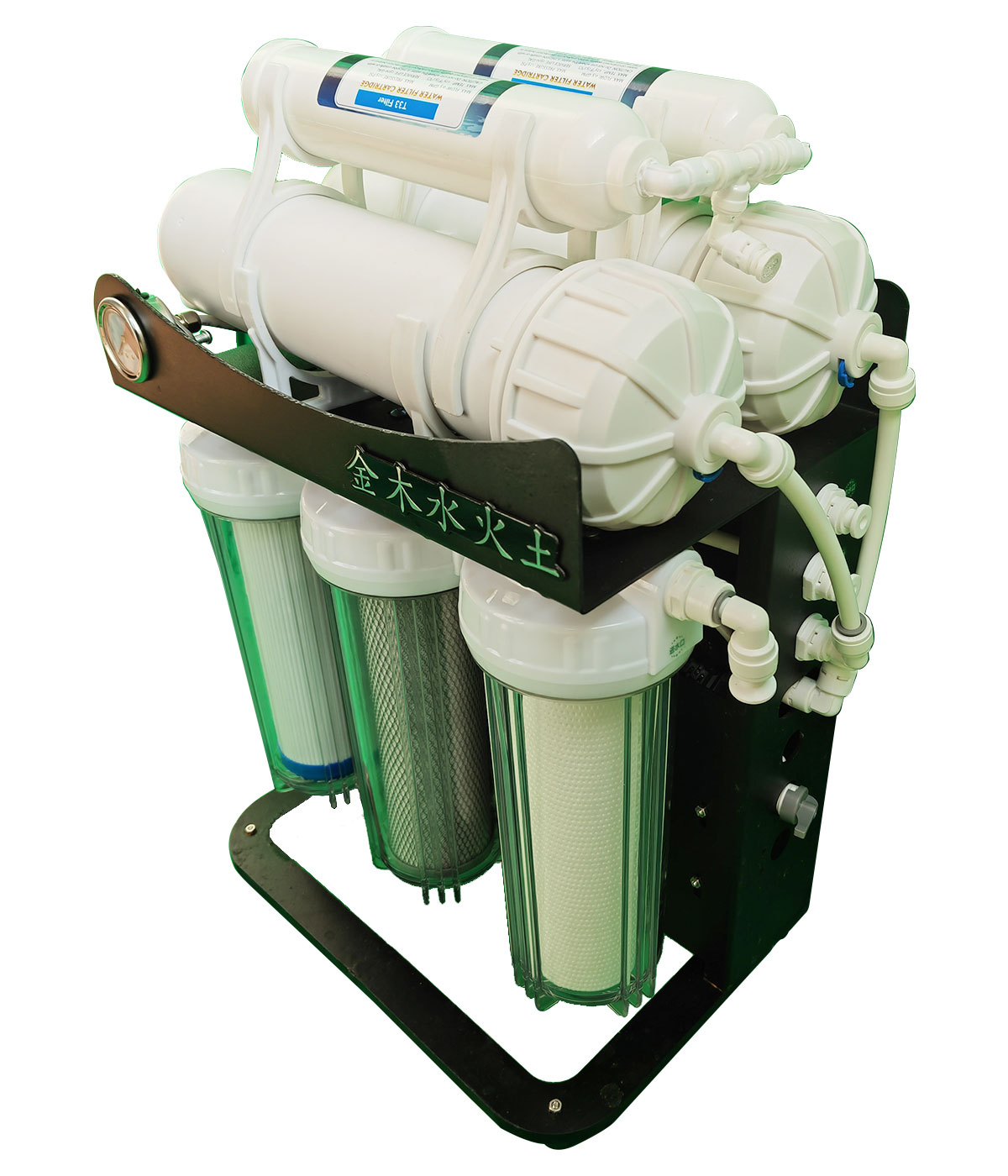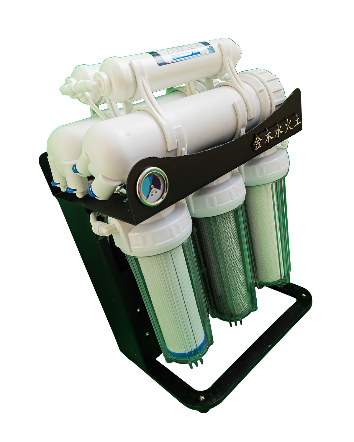 是一种通过目前国际流行的反渗透过滤办法,对原水进行加压,利用物理原理过滤处理,然后不添加任何化合物,生产出可供人类直接饮用的纯净水机器(也称为终端净水设备)。采用水质符合中国卫生部《中国国家生活饮用水水质卫生规范》规定的市政自来水为原水,颗粒活性炭和压缩活性碳2个滤芯和1个PP棉溶喷滤芯对原水进行预过滤,再对预过滤水通过增压泵施加压力令其通过孔径大小为0.0001微米的RO膜,最后通过材质为果壳(椰壳)的后置活性碳(又名小T33)调节水的酸碱度,增加水的含养量,改善水的口感而生产出纯净水。
